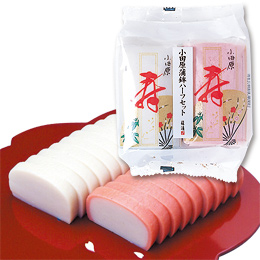 魚肉はグチのみを使用し、澱粉とリン酸塩を使用せずに作りました。かまぼこ本来の風味と歯ごたえをお楽しみ頂けます。赤色はトマト色素を使用。