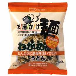 国産小麦の小麦粉を使用して植物油で揚げた中太麺と、かつおと昆布だしを効かせ、醤油の風味引き立つ香り高い特製つゆのうどん。お湯をかけて5分のかんたん調理。わかめ入り。