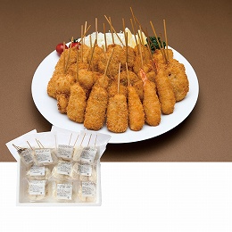 野菜類、魚介類、肉類をバラエティ豊かに選び、1本1本手作業で丁寧に串打ちしました。ご家庭で簡単に揚げられますので、お手軽に揚げたての串揚げがお楽しみ頂けます。冷凍のまま180℃の油で3〜4分揚げれば食べごろです。タレはついておりませんので、お好みで塩、ソースなど付けてお召し上がりください。4〜6名様用。