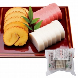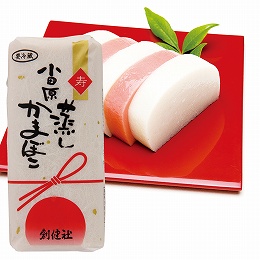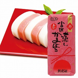 魚肉はグチのみを使用し、澱粉とリン酸塩を使用せずに作りました。かまぼこ本来の風味と歯ごたえをお楽しみ頂けます。赤色はトマト色素を使用。