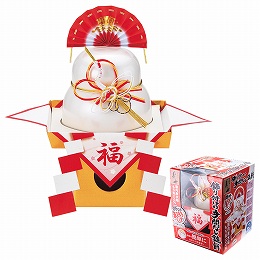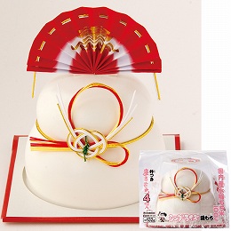 箱から取り出し、上に扇を乗せるだけの簡単便利な鏡餅です。中身は国産水稲もち米を、杵つき製法で作った個包装の丸もちです。使いやすさと見た目の華やかさを両立させた商品です。