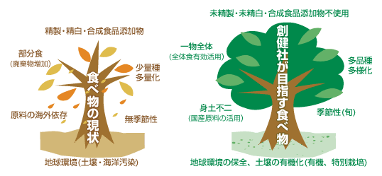 食べ物はまさしく、環境による産物であり、それ以外の何ものでもありません。しかし、その現状は、文明の近代化とともに土壌や海洋の汚染が進み、一方、製造・製法過程においても過度の精製や効率化追求により、食べ物本来の力が失われつつあります。現代の科学技術は、この環境浄化と食物の再生にこそ注力すべきであり、その回復、改善に当社は全面的に賛同し、協力してまいります。