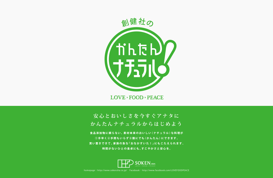 かんたんナチュラルは、化学合成された食品添加物に頼らない、素材本来の味を楽しめるおいしいナチュラルな料理を「手早く」「手間もいらず」「誰にでもかんたんに」作成できる、創健社が提供する食べ方のスタイルです。