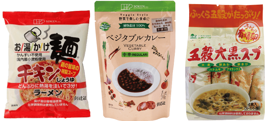 もちろん、創健社のインスタント食品では不要な合成添加物は一切使っていません。原材料・製法も他のすべての商品と同様、素材本来のおいしさを大切にし、食卓に笑顔をもたらす「LOVE > FOOD > PEACE」な食品を取り揃えています。