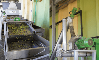 投入されたオリーブの実は、初めに風力選別機で枝、葉などの夾雑物を除去した後に水で洗浄されます。そしてクラッシャー(破砕機)でオリーブの実を種ごと破砕しペースト状にしていきます。