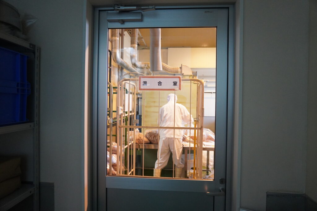 そこから袋詰めをする際も、また別の「袋詰め専用の個室」へと運ばれます。 「混ぜる場所」と「詰める場所」を物理的に分けることで、目に見えない埃や菌の侵入を徹底的にブロックしているのですね。この「移動してまで分ける」という手間こそが、安心の証なのです。
