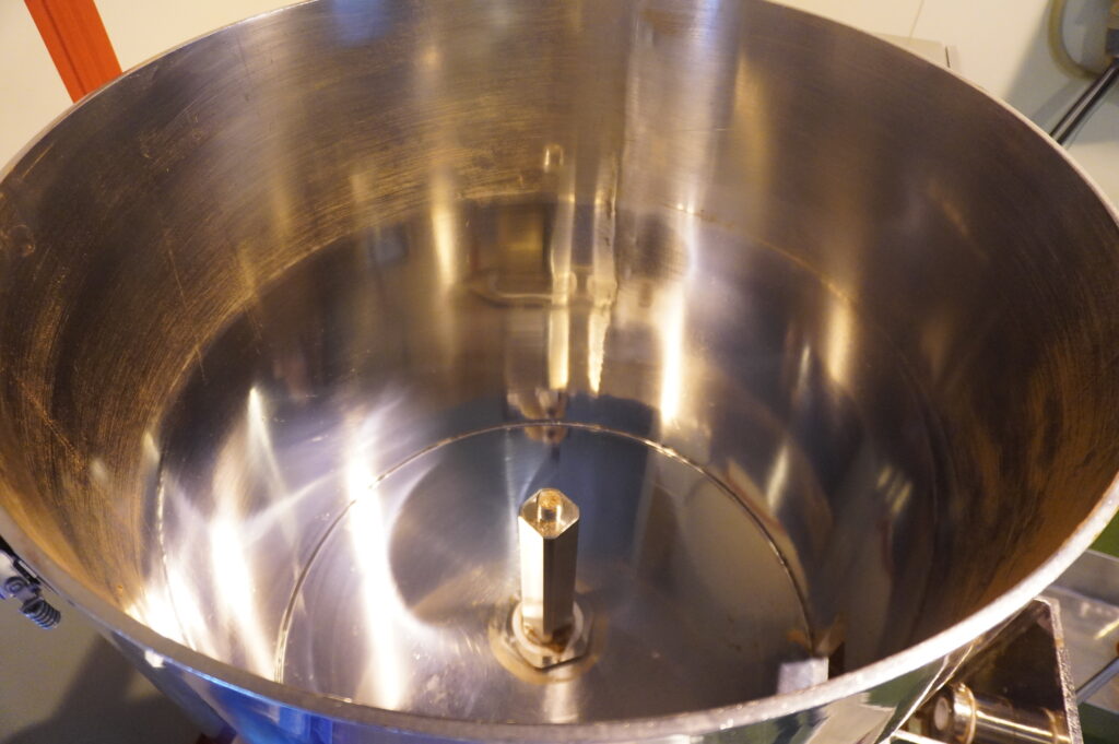 工場の扉を開けて驚いたのは、その清々しいほどの清潔感です。 特に驚いたのが、原料を混ぜ合わせる大きな機械の扱いでした。