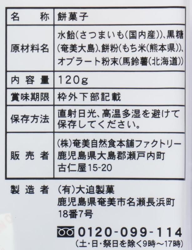 水飴(さつまいも(国内産))、黒糖(奄美大島)、餅粉(もち米(熊本県))、オブラート粉末(馬鈴薯(北海道))