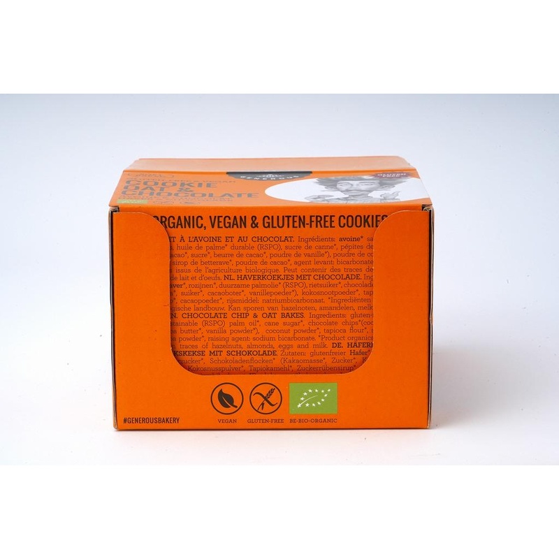 有機オーツ麦、有機レーズン、有機パーム油、有機さとうきび糖、有機チョコレートチップ(有機カカオマス、有機さとうきび糖、有機カカオバター、有機粉末バニラ)、有機粉末ココナッツ、有機タピオカ粉、有機ビーツシロップ、有機粉末ココア/重曹