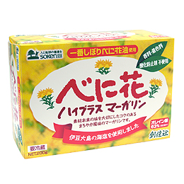 一番搾りの高オレイン酸べに花油を主原料に素材の持つおいしさを大切にした無香料、無着色、酸化防止剤不使用のマーガリン。トランス脂肪酸の少ない製法で作りました[約0.03g/10g]。部分水素添加油脂不使用。