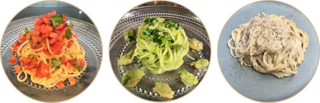 有機栽培デュラム小麦のセモリナ挽きに、赤色は有機トマトパウダーを、緑色は有機ほうれん草パウダーをブレンド。