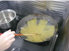鍋は、中華鍋を使う。お湯は、パスタ100gにつき500ml、塩は5g。中華鍋を用いる理由は、底が丸くなっているのでお湯の分量が平たい鍋の半分になります。ですから、塩の分量も半分、お湯を沸かすエネルギーも半分とエコクッキングになります。但し、鍋が安定するように五徳などを用いてください。