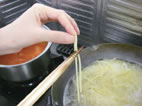 パスタ100gにお湯1リットル、塩10g(約小さじ2杯・おすすめは地中海の天日塩)、スパゲッティは深鍋、ショートパスタは口の広い鍋を使用します。 お湯が沸騰したら、塩を入れ、パスタを入れた後、1分ほどパスタ同士がくっつかないようにほぐし、パスタが動く程度の火加減に保ちながらゆでます。規定時間のおよそ1分前にパスタを1本取り出してゆで具合をチェックして、ゆで時間を調整します。これで、パスタに塩味をしっかりとつけるようにゆでることができます。さらに続いてパスタソースが良くからみ、表面に味がしみこむためのウラ技をご案内させていただきます。