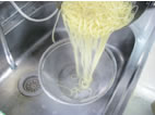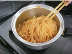 パスタは、パッケージに記載されているゆで時間の約1分前に湯切りをして、別の鍋で予め良く温めておいたパスタソースに混ぜながら高温で残りの約1分間加熱します。この作業で、パスタソースがパスタに良く味が染み込んで美味しくなります。またパスタのゆで加減もちょうど良くなります。