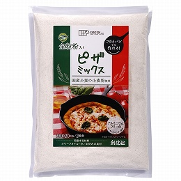 国産小麦の小麦粉と国産小麦の全粒粉を使用したピザミックス。食物繊維の補給にも。発酵不要で、フライパンでも手軽に作れます。アルミニウムフリーのベーキングパウダー使用。直径約20cm2枚分。