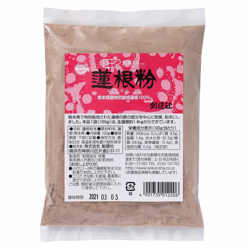 熊本県で有機栽培された蓮根(備中種・早生種)の主に節を乾燥、粉末にした有機JAS認証品。本品1袋(80g)は生の蓮根約1.2Kg分。飲み物に溶かしたり、そのままでも。食物繊維・鉄を豊富に含みます。