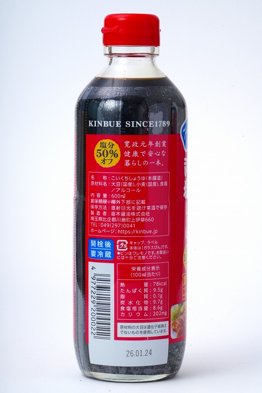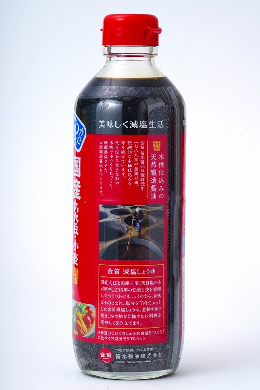 ○創業200年の伝統的手法により、丸大豆、小麦、天日塩のみを原料とし、豊かな自然の中、大きな杉桶でゆっくり醗酵・熟成させた本醸造醤油から独自の方法により旨味成分はそのままで普通のこいくちしょうゆ(食塩分17.5%)に比べて食塩分を50%カット。