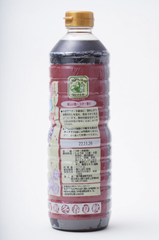 ○本醸造うすくち醤油に、昆布とかつお節のだしを加え、色をうすく仕上げております。