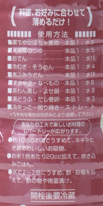 ○ひやむぎ、そうめん、うどんなどの麺類のつゆとしてはもちろん、本品を希釈することで、茶碗蒸しや鍋物、だし巻き卵の味付けとして使用できます。