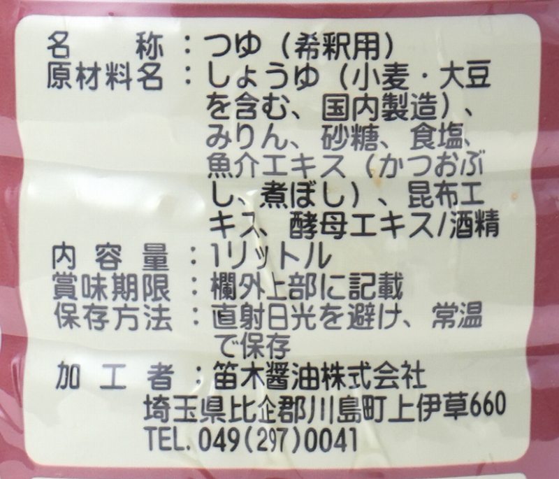 しょうゆ(小麦・大豆を含む、国内製造)、みりん、砂糖、食塩、魚介エキス(かつおぶし、煮ぼし)、昆布エキス、酵母エキス/酒精