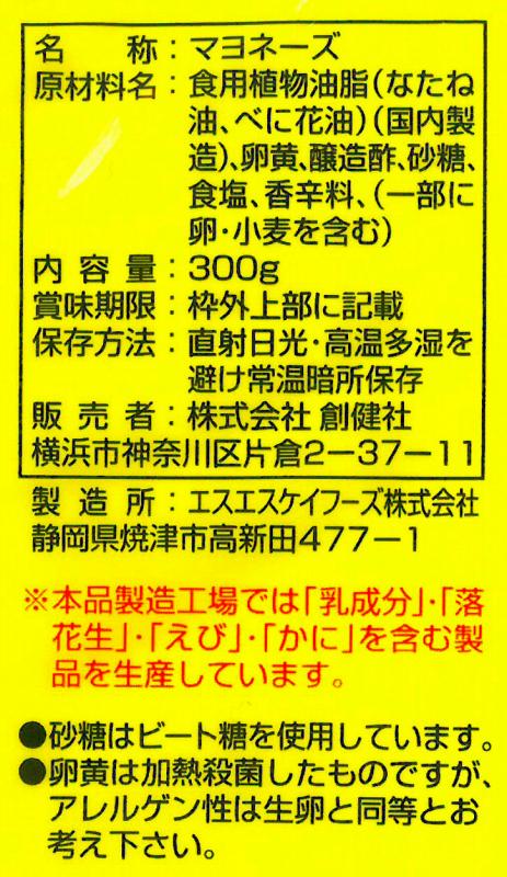 食用植物油脂(なたね油、べに花油)(国内製造)、卵黄、醸造酢、砂糖、食塩、香辛料、(一部に卵・小麦を含む)
