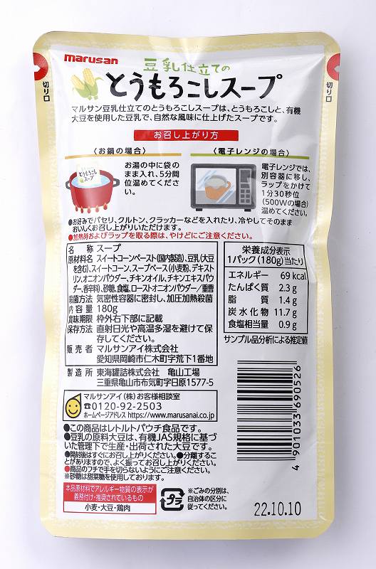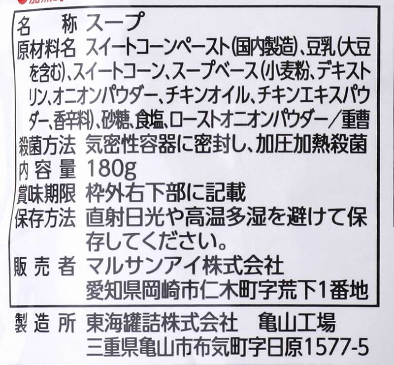 スイートコーンペースト:国内製造(とうもろこし(国産))、豆乳(大豆を含む)、スイートコーン(とうもろこし(国産))、スープベース(小麦粉、デキストリン、オニオンパウダー、チキンオイル、チキンエキスパウダー、香辛料)、砂糖(てんさい(国産))、食塩、ローストオニオンパウダー/重曹