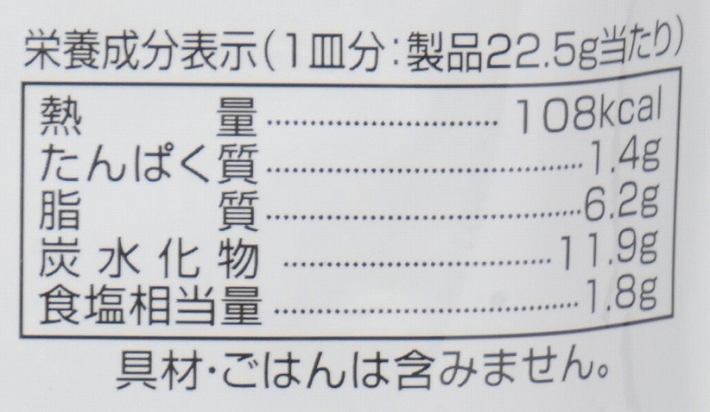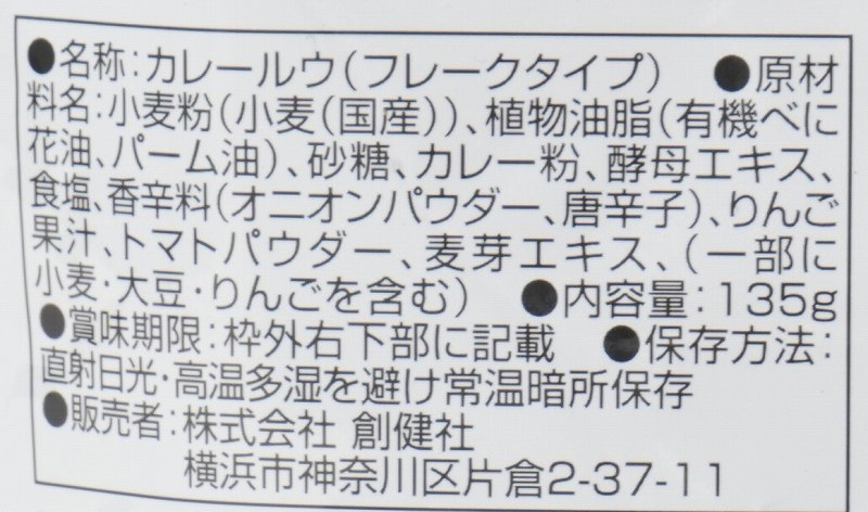 小麦粉(小麦(国産))、植物油脂(有機べに花油、パーム油)、砂糖、カレー粉、酵母エキス、食塩、香辛料(オニオンパウダー、唐辛子)、りんご果汁、トマトパウダー、麦芽エキス、(一部に小麦・大豆・りんごを含む)