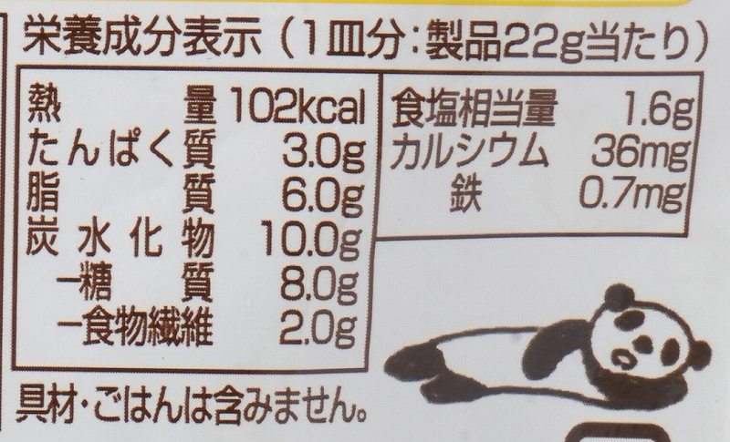 植物油脂(パーム油、菜種油)(国内製造)、小麦粉(北海道)、大豆粉(新潟)、砂糖(鹿児島)、カレー粉、食塩(メキシコ)、桑の葉粉(国産)、酵母エキス、りんご果汁(国産)、粉末醤油(国産他海外)、ひじき粉(国産)、トマトパウダー(スペイン他海外)