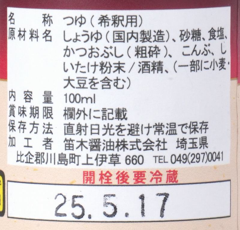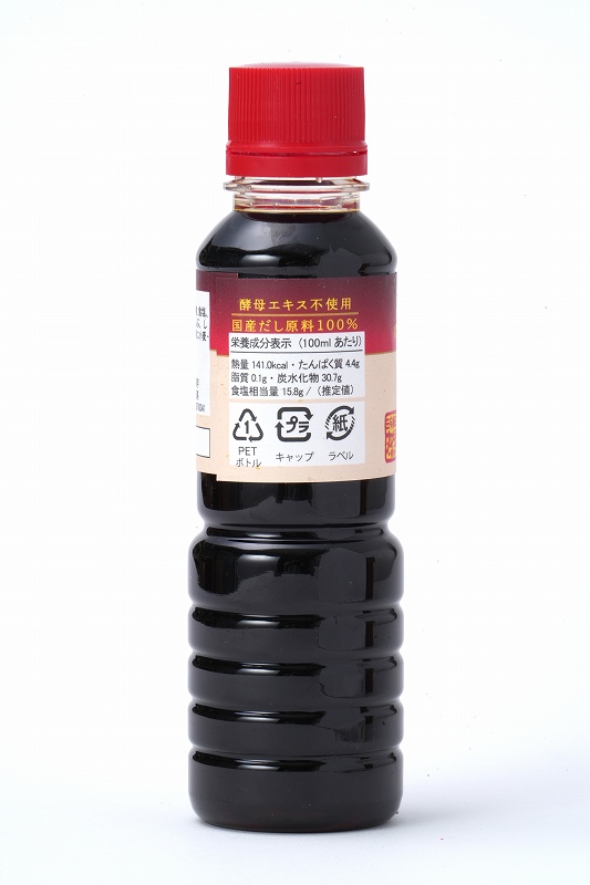 しょうゆ(国内製造)、砂糖、食塩、かつおぶし(粉砕)、こんぶ、しいたけ粉末/酒精、(一部に小麦・大豆を含む)