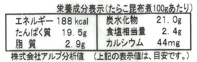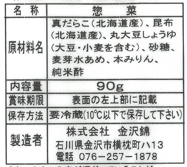 真だらこ(北海道)、昆布(北海道)、丸大豆しょうゆ:大豆・小麦を含む(石川)、砂糖(北海道)、麦芽水あめ(大阪、鹿児島)、本みりん(愛知)、純米酢(石川)