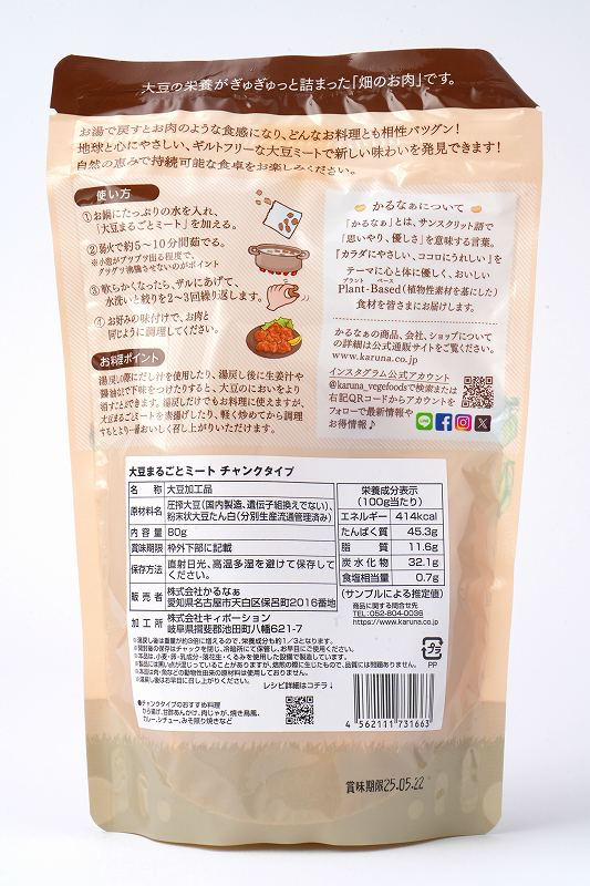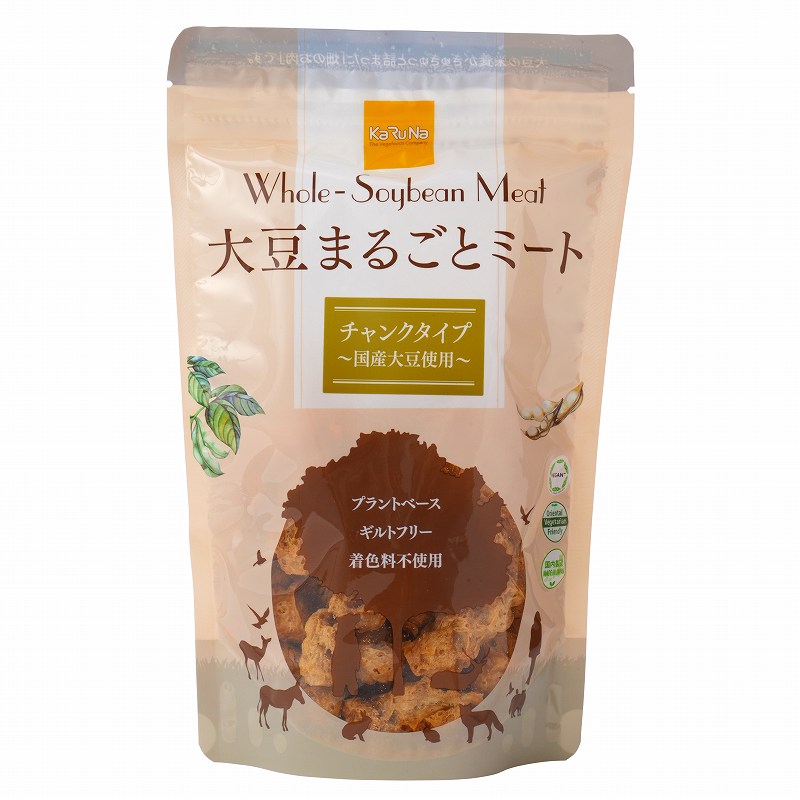 大豆をまるごと使用。お湯で戻すと鶏もも肉のような食感です。湯戻し後、から揚げや肉じゃがなどいろいろなお料理にどうぞ。湯戻し約5分。