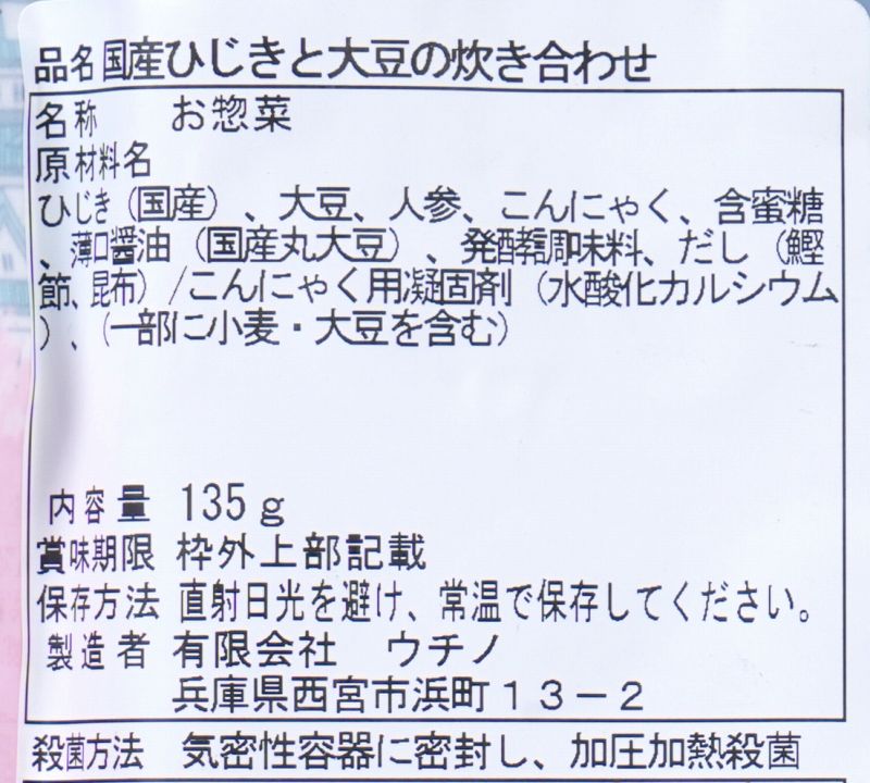 ひじき(国産)、大豆、人参、こんにゃく、含蜜糖、薄口醤油(国産丸大豆)、発酵調味料、だし(鰹節、昆布)/こんにゃく用凝固剤(水酸化カルシウム)、(一部に小麦・大豆を含む)