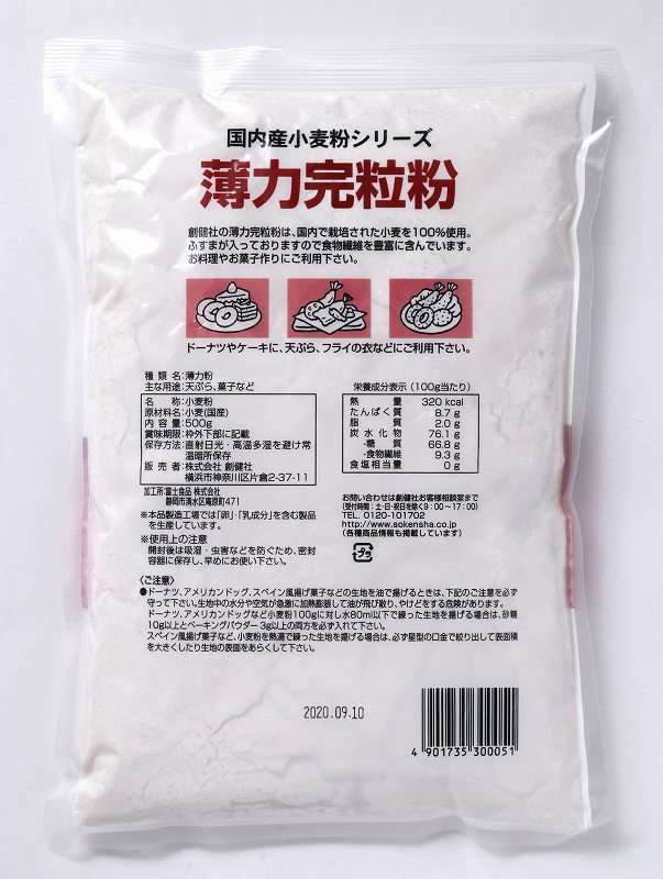 国内で栽培された小麦を100%原料にしています。ふすまを含む完粒粉ですので食物繊維が豊富です。