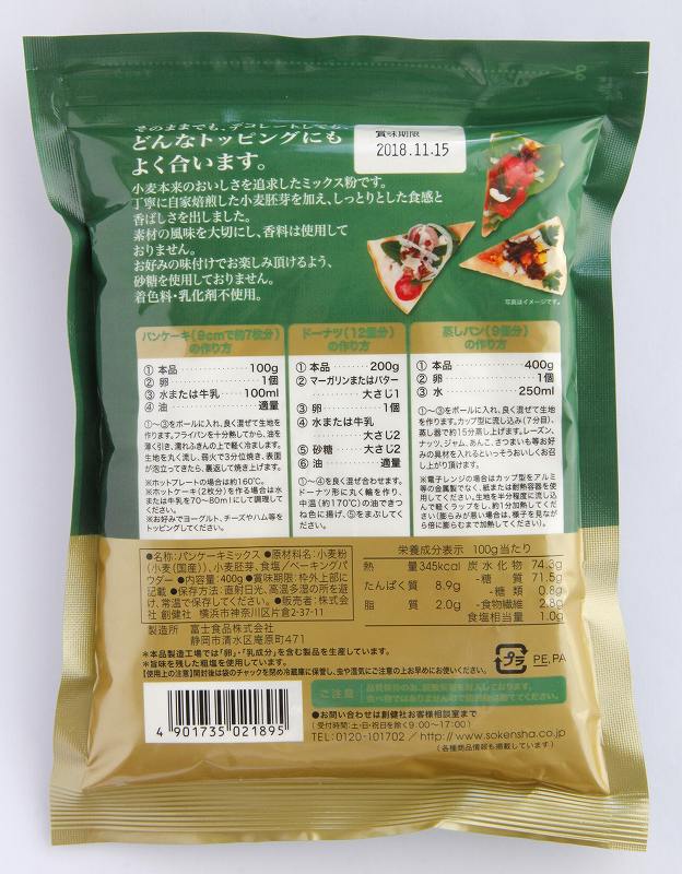 国産小麦の小麦粉に焙煎小麦胚芽のまろやかな甘みと香ばしさをプラス。小麦本来のおいしさを追求したミックス粉(砂糖不使用)。食塩は沖縄の海水塩使用。アルミニウムフリーのベーキングパウダー使用。