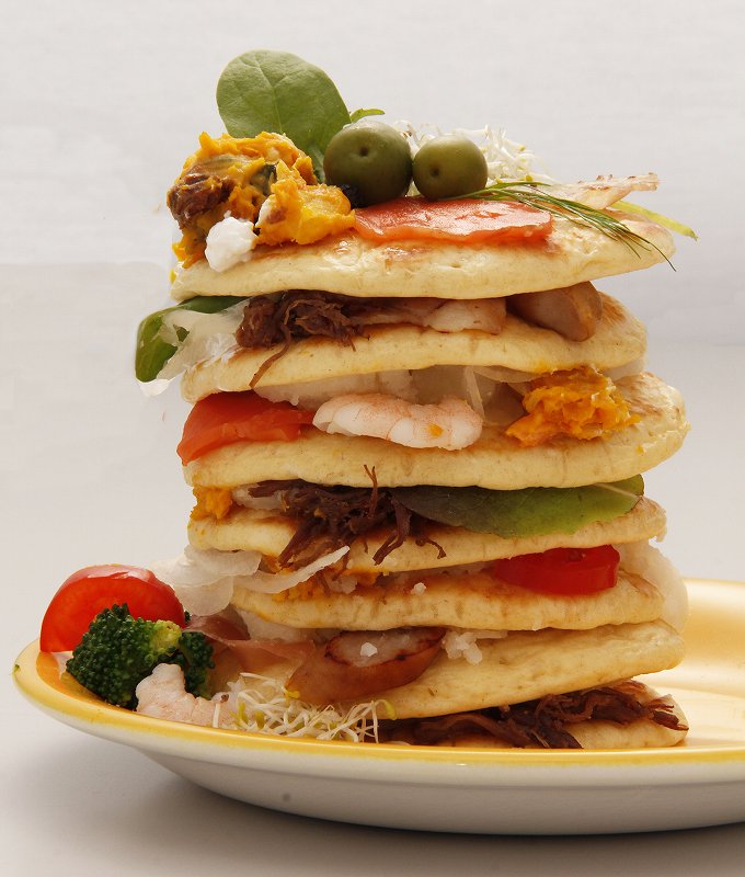 ★1〜3をボールに入れ、良く混ぜてから生地を作ります。フライパンを十分熱してから、油を薄く引き、濡れふきんの上で軽く冷まします。生地を丸く流し、弱火で3分位焼き、表面が泡立ってきたら、裏返して焼き上げます。