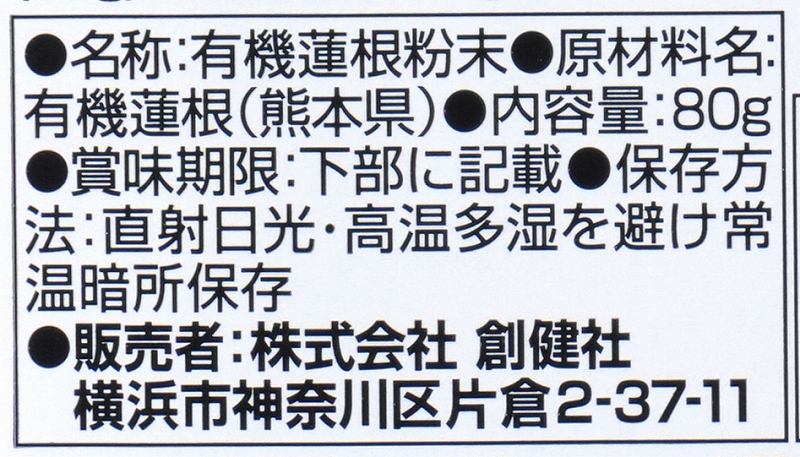 熊本県で有機栽培された蓮根(備中種・早生種)の主に節を乾燥、粉末にした有機JAS認証品。本品1袋(80g)は生の蓮根約1.2Kg分。飲み物に溶かしたり、そのままでも。食物繊維・鉄を豊富に含みます。