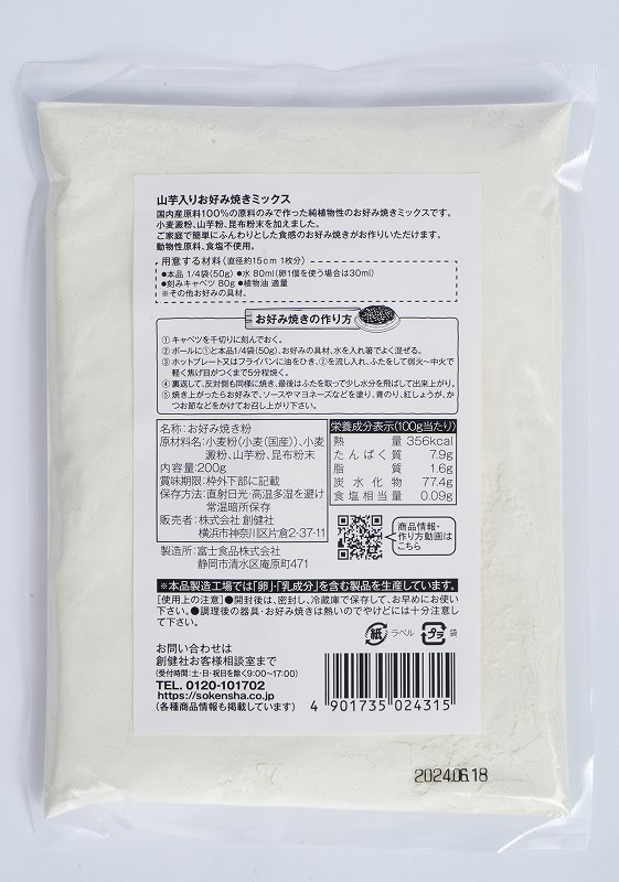 国産原料100%の原料のみで作った純植物性のお好み焼きミックスです。小麦澱粉、山芋粉、昆布粉末を加えました。動物性原料、食塩不使用。直径約15cm4枚分。