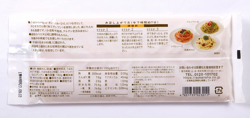 3種の雑穀「きび・あわ・ひえ」につなぎとして、タピオカでん粉(加工デンプン)を使用した、歯ごたえのある食感のパスタです。小麦粉不使用、グルテンを含みません。(ゆで時間約7分)