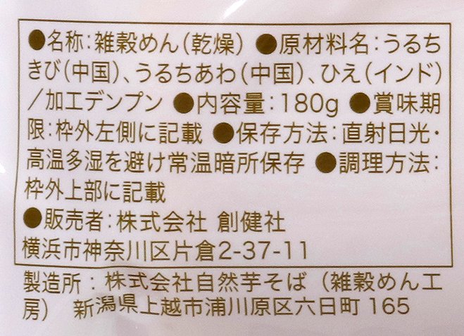 ○3種の雑穀「きび・あわ・ひえ」につなぎとして、タピオカでん粉(加工デンプン)を使用した、歯ごたえのある食感のパスタです。
