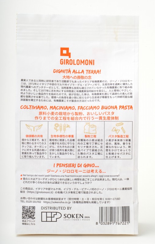 ○イタリア有機農業の父、ジーノ・ジロロモーニが設立したジロロモーニ農業協同組合と、その組合に認定された生産農家が栽培した有機栽培デュラム小麦のみを使用。
