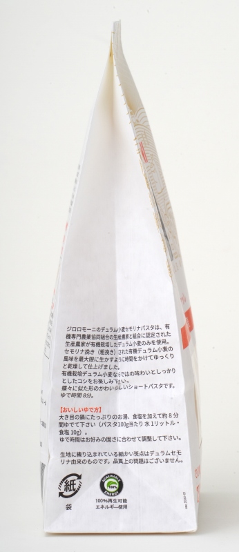 ○栽培から製粉・パスタ製造まで組合内で行う一貫生産体制。有機栽培デュラム小麦のセモリナ(粗挽き粉)の風味とおいしさ、栄養素を出来るだけ損なわないようにじっくりと時間をかけて乾燥して仕上げたショートパスタです。小麦本来の味と香り、強いコシをお楽しみいただけます。
