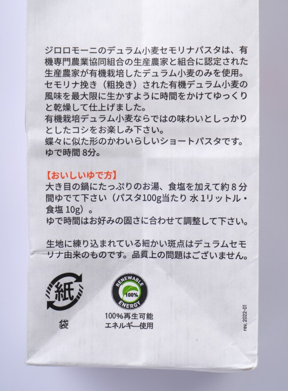 イタリアの有機栽培デュラム小麦をセモリナ挽き(粗挽き)し、風味を壊さないようじっくり時間をかけて乾燥しました。蝶々に似た形のかわいらしいショートパスタです。ゆで時間8分。