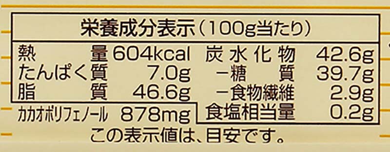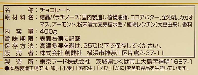 結晶パラチノース(国内製造)、植物油脂、ココアバター、全粉乳、カカオマス、アーモンド、粉末還元麦芽糖水飴/植物レシチン(大豆由来)、香料