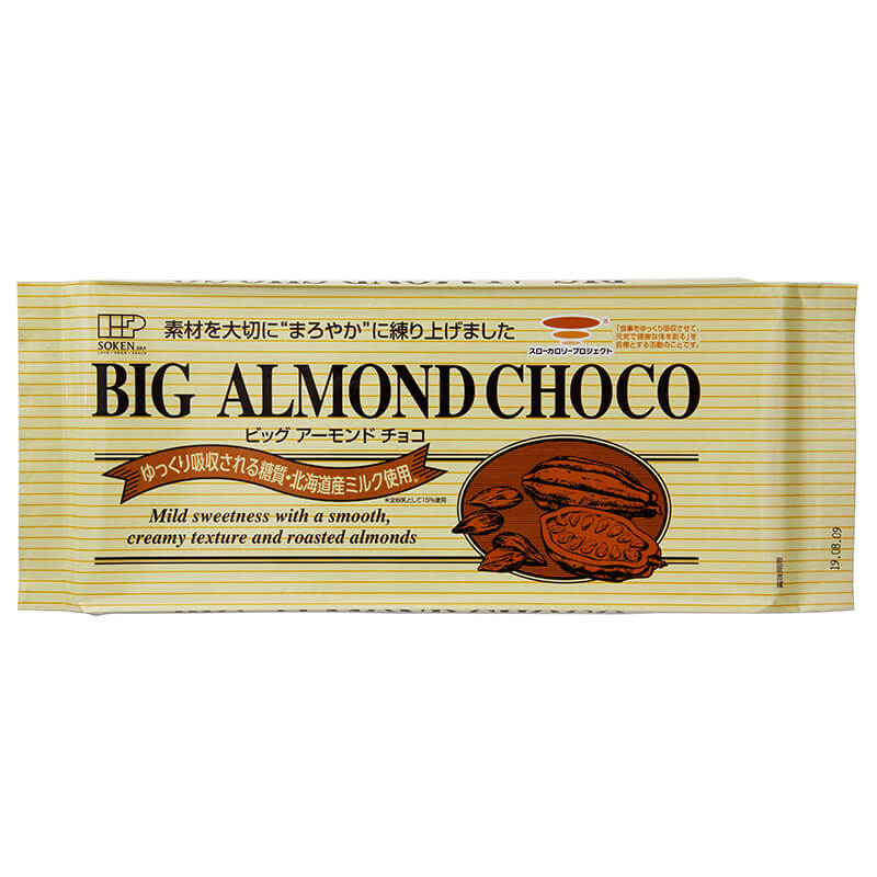 砂糖の代わりにパラチノース・還元麦芽糖水飴を使用。香ばしいアーモンドを粒のまま入れたビッグサイズのチョコレート。