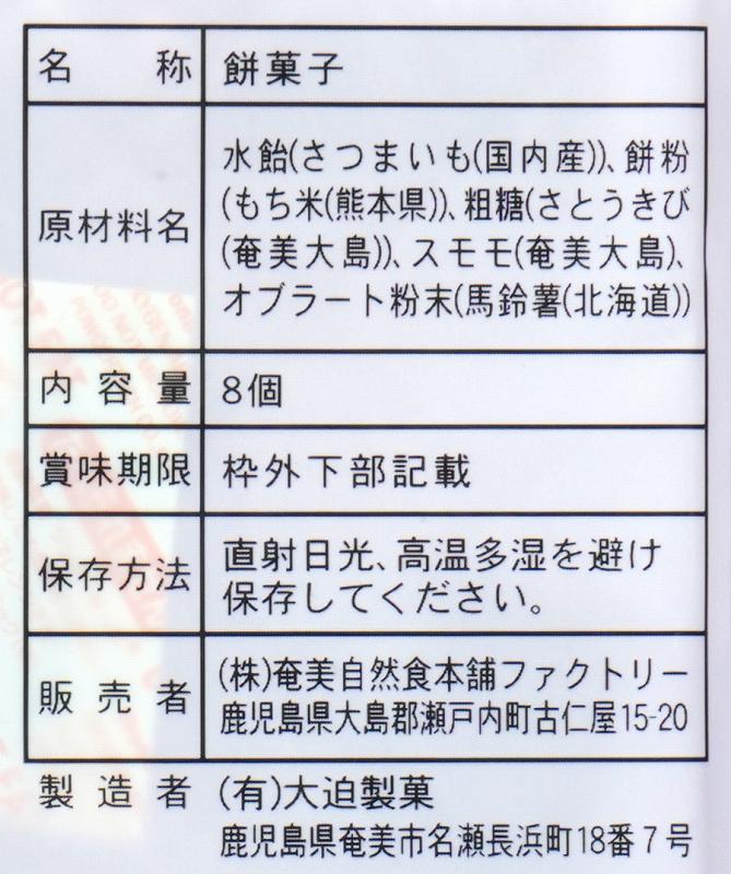 水飴(さつまいも(国内産))、餅粉(もち米(熊本県))、粗糖(さとうきび(奄美大島))、スモモ(奄美大島)、オブラート粉末(馬鈴薯(北海道))