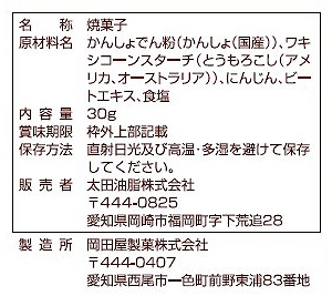 かんしょでん粉(かんしょ(国産))、ワキシコーンスターチ(とうもろこし(アメリカ、オーストラリア))、にんじん(国産)、ビートエキス(北海道)、食塩(瀬戸内海)