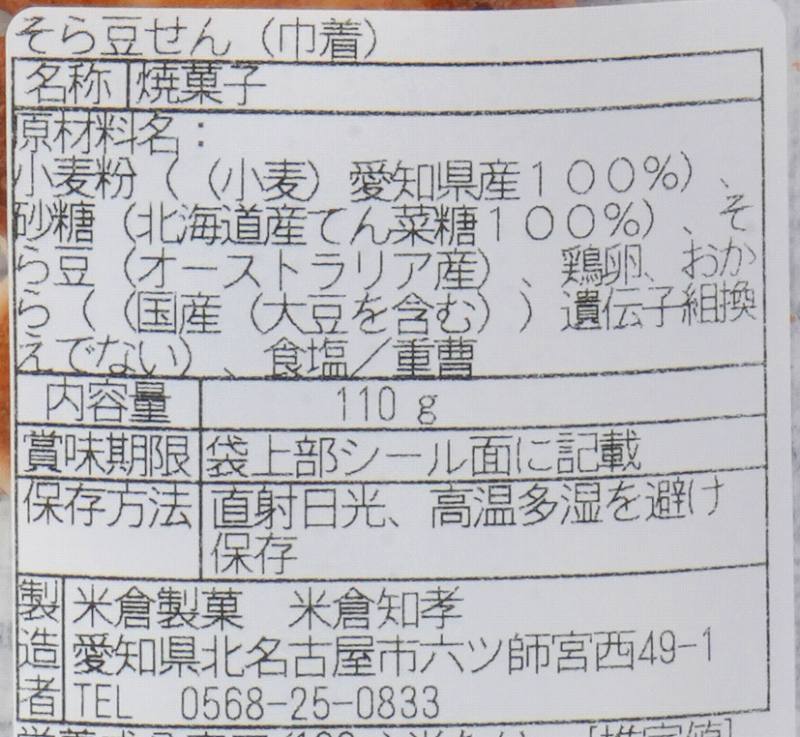 小麦粉(小麦(愛知))、砂糖(てんさい糖(北海道))、そら豆(オーストラリア)、鶏卵(愛知他国産)、おから(大豆:遺伝子組換えでない(国産))、食塩/重曹