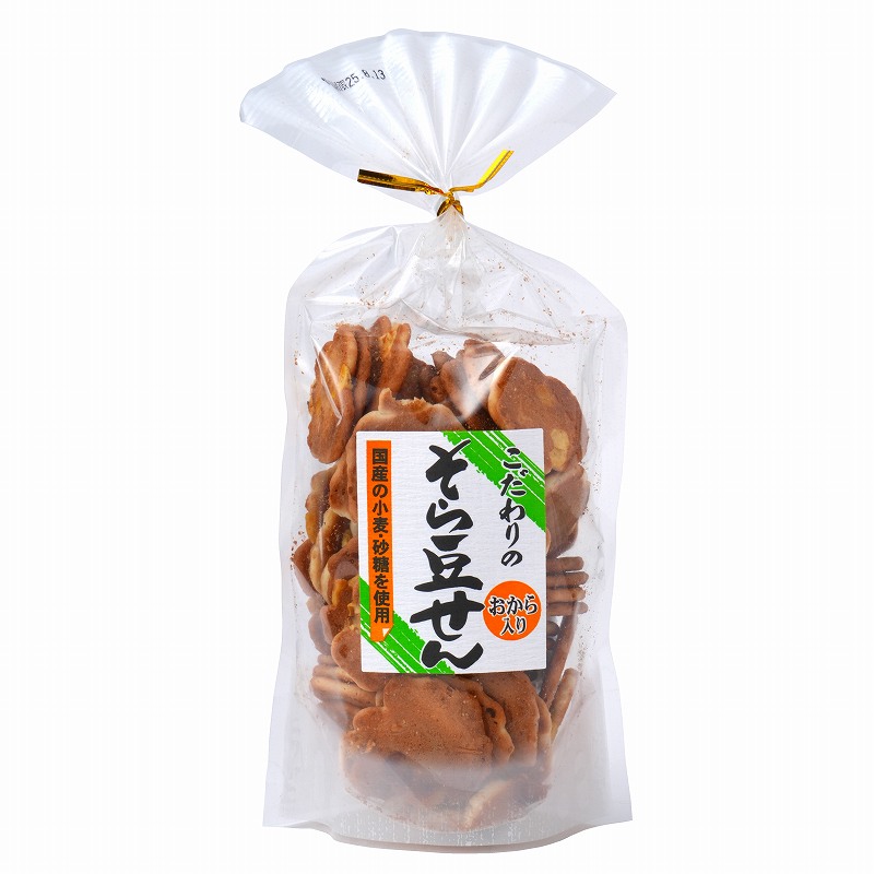小麦粉(小麦)(愛知県産100%)、砂糖(北海道産てん菜糖100%)、そら豆(オーストラリア産)、鶏卵、おから((国産(大豆を含む))遺伝子組換えでない)、食塩/重曹