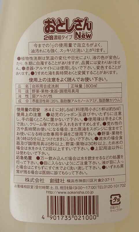 主原料は、純植物性ヤシ油。手にマイルドで冷水によく溶け、泡立ち、油汚れにも強く、すすぎも簡単な台所洗剤。濃縮タイプですので、少量でご使用になれます。