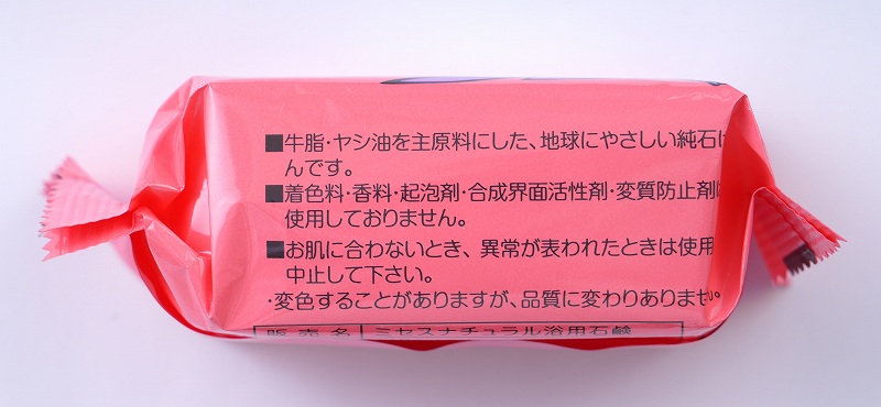 99%以上石鹸分を含有する純質石鹸。着色料・香料・起泡剤・合成界面活性剤、変質防止剤等の添加物は使用しておりません。